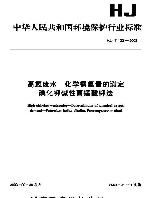 HJT 132-2003 是一项关于高氯废水中化学需氧量(COD)测定的标准方法,采用碘化钾碱性高锰酸钾法。该标准适用于高氯废水的COD测定。