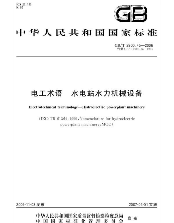 GBT 2900.45-2006 是中国国家标准中关于水电站水力机械设备的专业术语标准,它为水电行业的技术交流和规范制定提供了重要依据。这一标准主要定义了与水电站水力机械设备相关的专业术语及其解释,涵盖了从设备设计到运行维护的全过程。