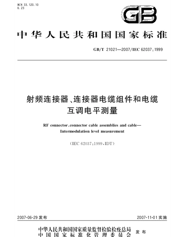 摘要:本文件规定了射频连接器、连接器电缆组件和电缆的互调电平测量方法,包括测试条件、测试设备及测试步骤。本文件适用于射频连接器及相关组件的性能评估与质量控制。