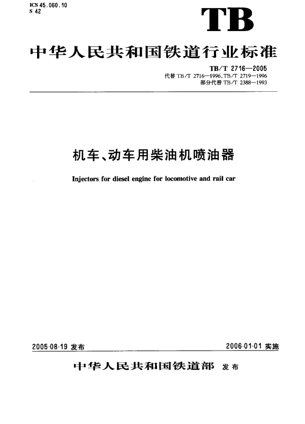 《TBT2716-2005 机车、动车用柴油机喷油器》是一项针对铁路运输中使用的柴油机喷油器的行业标准。该标准由中华人民共和国铁道部发布,旨在规范机车和动车组所用柴油机喷油器的设计、制造、检验及使用要求,确保其性能稳定、安全可靠。