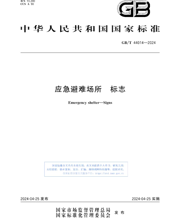 《GBT 44014-2024 应急避难场所 标志》是一项国家标准,旨在规范应急避难场所相关标志的设计、设置和使用,提高公众在突发事件中的安全意识和应对能力。该标准由国家市场监督管理总局和中国国家标准化管理委员会发布,自2024年实施以来,为各类应急避难场所的标识系统提供了统一的技术依据。