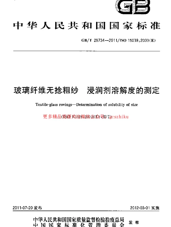 《GBT 26734-2011 玻璃纤维无捻粗纱 浸润剂溶解度的测定》是一项关于玻璃纤维无捻粗纱中浸润剂溶解度测定的国家标准。该标准由中华人民共和国国家质量监督检验检疫总局和中国国家标准化管理委员会于2011年发布,旨在为玻璃纤维制品的质量控制提供科学、规范的检测方法。