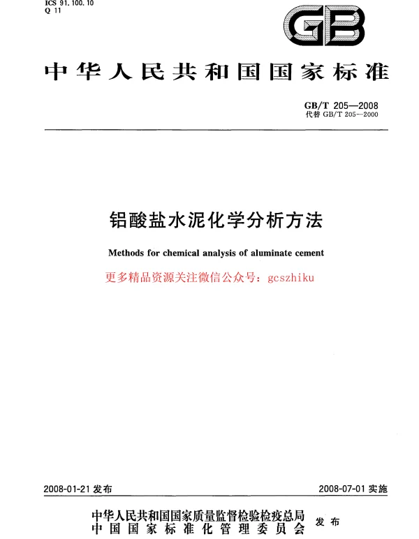 《GBT 205-2008 铝酸盐水泥化学分析方法》是由中国国家标准化管理委员会发布的国家标准,用于规范铝酸盐水泥的化学成分分析方法。该标准自2008年实施以来,为铝酸盐水泥的生产、质量控制和应用提供了重要的技术依据。