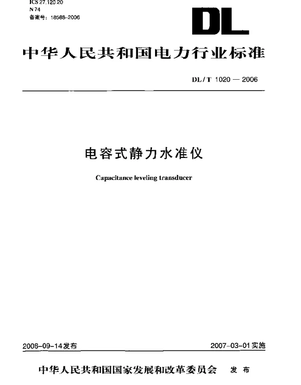 《DLT1020-2006 电容式静力水准仪》是中国电力行业标准之一,主要用于电力系统中对设备或结构的沉降进行精确测量。该标准规定了电容式静力水准仪的技术要求、试验方法、检验规则及标志、包装、运输和贮存等内容,为电容式静力水准仪的设计、生产、使用和维护提供了统一的技术依据。