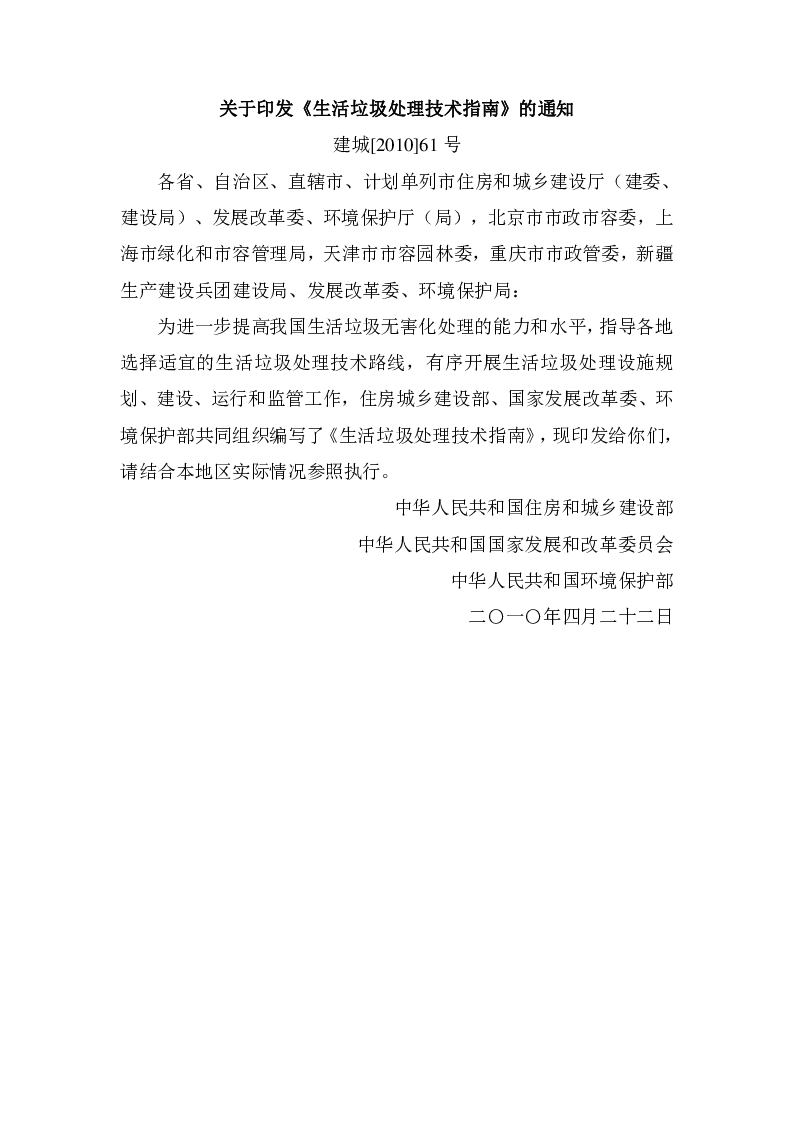 《建城[2010]61号关于印发《生活垃圾处理技术指南》的通知》是由住房和城乡建设部发布的指导性文件,旨在规范我国生活垃圾处理工作。该指南明确了生活垃圾处理的技术路线、工艺选择及管理要求,强调了减量化、资源化和无害化原则。通知要求各地结合实际情况,科学制定垃圾处理方案,提升城市环境管理水平。同时,鼓励采用先进技术,推动生活垃圾处理的可持续发展。
