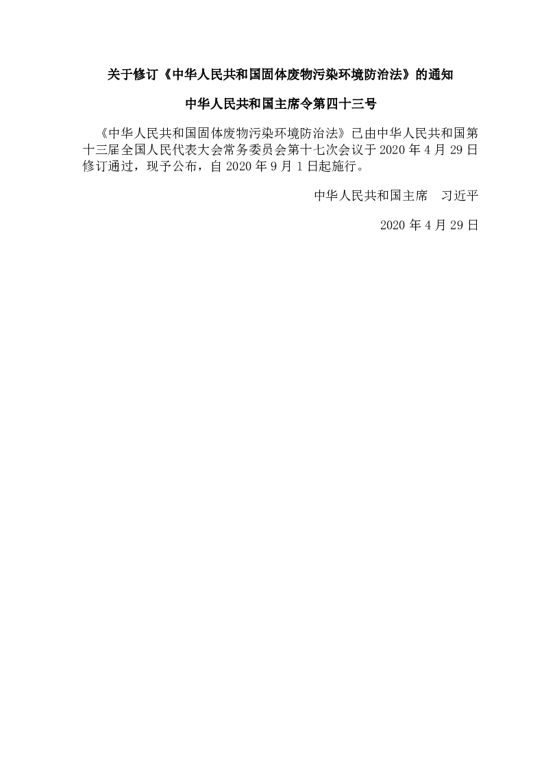 《中华人民共和国主席令第四十三号中华人民共和国固体废物污染环境防治法(2020年修订)》是2020年4月29日由中华人民共和国主席习近平签署发布的法律文件。该法对原《固体废物污染环境防治法》进行了全面修订,强化了对固体废物的管理与污染防治措施,明确了政府、企业和社会各界的责任。新法强调源头减量、资源化利用和无害化处理,特别加强了对生活垃圾、危险废物等重点领域的监管,旨在推动生态文明建设,保障公众健康和生态环境安全。