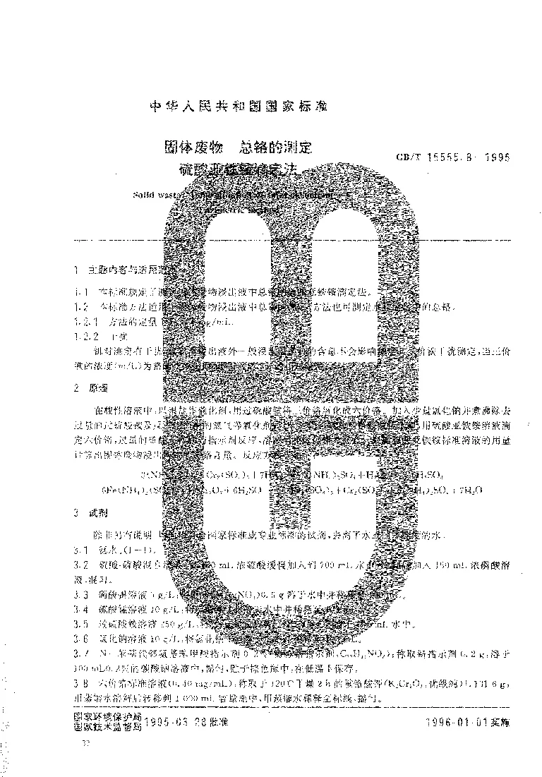 《GBT 15555.8-1995 固体废物 总铬的测定 硫酸亚铁铵滴定法》是中华人民共和国国家标准,用于测定固体废物中总铬含量。该方法通过将样品中的铬氧化为六价铬,再用硫酸亚铁铵进行滴定,从而计算出总铬的含量。此方法适用于各类固体废物中铬的测定,具有操作简便、结果准确的特点,广泛应用于环境监测和污染控制领域。