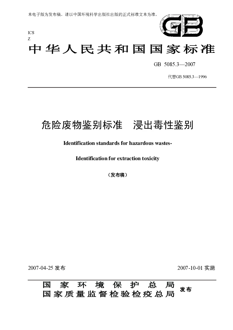 《GB 5085.3-2007 危险废物鉴别标准 浸出毒性鉴别》是中国国家标准,用于判断固体废物是否具有浸出毒性。该标准规定了危险废物的浸出毒性鉴别方法和限值,通过模拟废物在自然环境中与水接触时污染物的释放情况,评估其对环境和人体健康的潜在危害。该标准适用于各类工业固体废物的鉴别工作,为危险废物的管理提供了科学依据和技术支持。