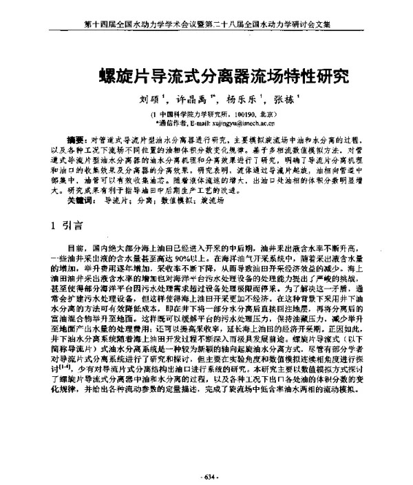《螺旋片导流式分离器流场特性研究》是一篇关于工业设备中流体分离技术的学术论文。该论文主要探讨了螺旋片导流式分离器在不同工况下的流场分布特性,旨在提高分离效率和设备运行稳定性。通过对分离器内部流体流动状态的深入分析,研究人员能够更好地理解其工作原理,并为优化设计提供理论依据。